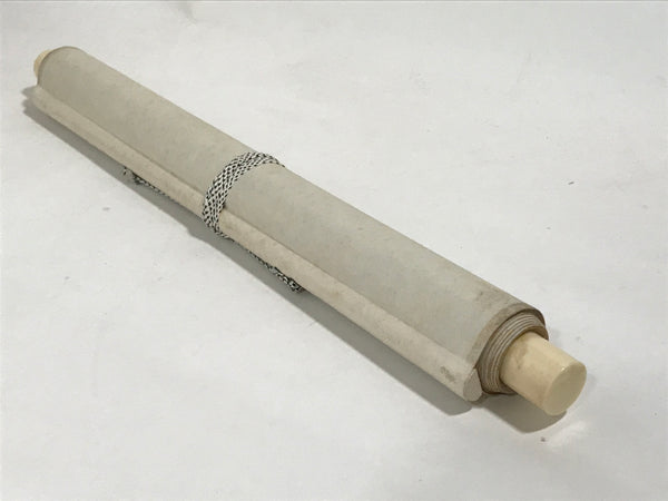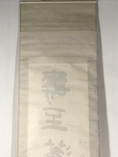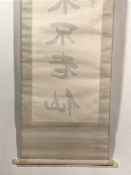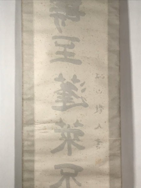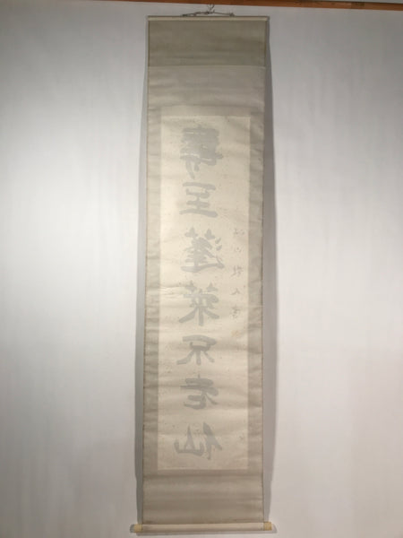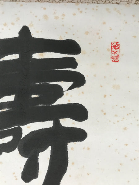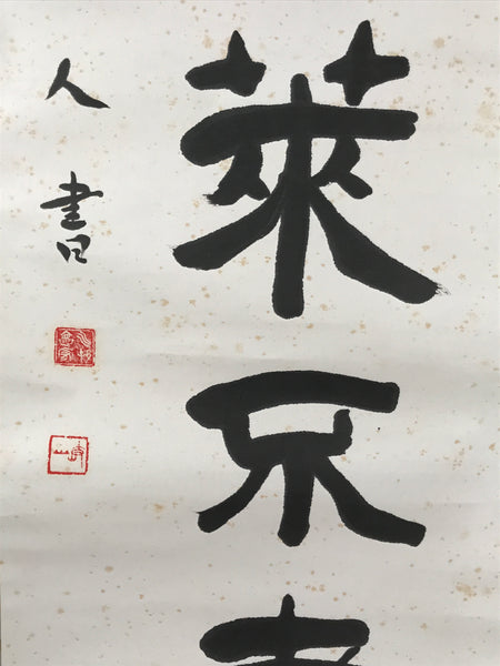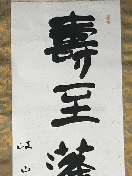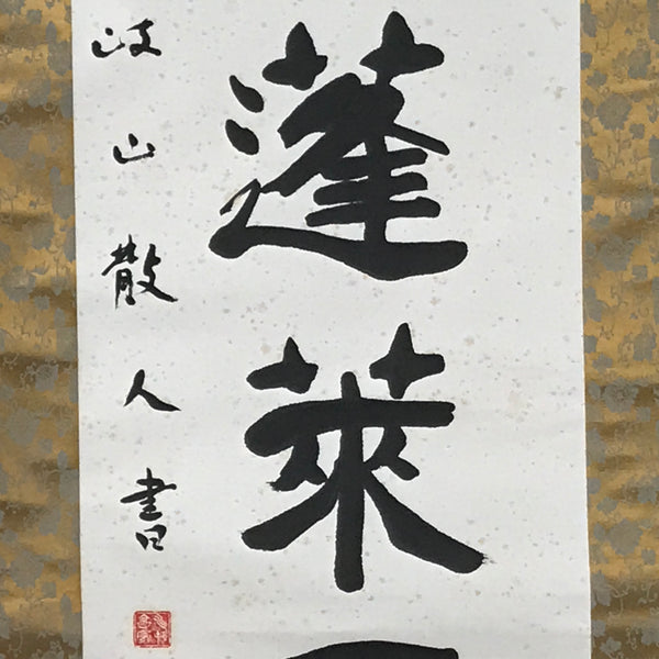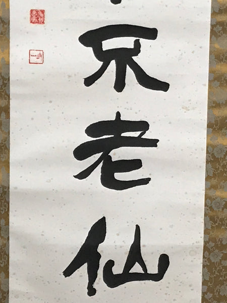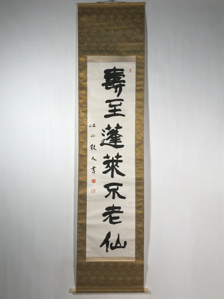 This vintage Japanese hanging scroll (kakejiku or makimono) features calligraphy of an idiom painted in black ink: "gain longevity like the legendary hermit who lives on Mount Horai". This piece is signed and has red seals.