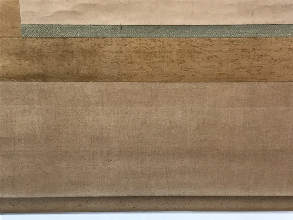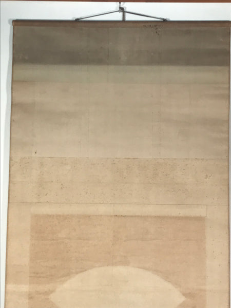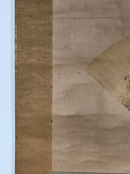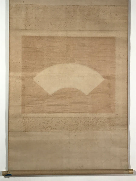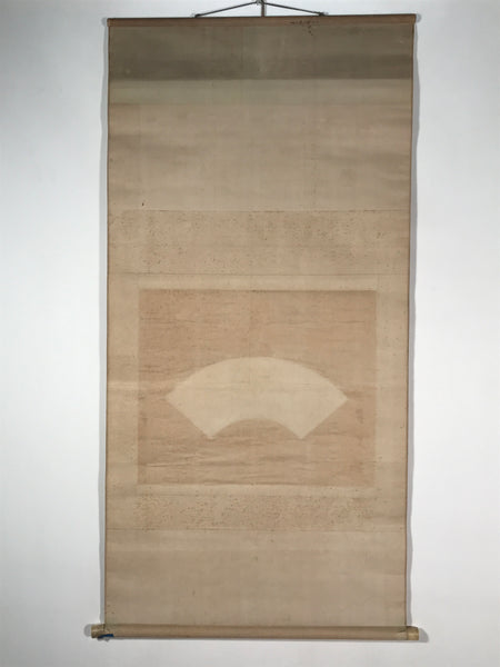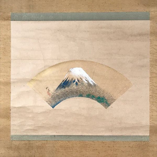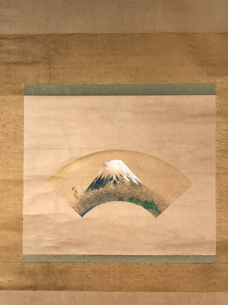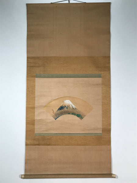 This vintage Japanese hanging scroll (kakejiku or makimono) features the top of a mountain, likely Mount Fuji, painted inside a fan shape. There are characters on the outside of the scroll. This piece is signed and has a red seal.