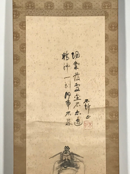 This vintage Japanese hanging scroll (kakejiku or makimono) features a portrait of a man with a fierce allure carrying swords. It is likely a portrait of Shoki, also known as Zhong Kui, a God who protects against evil beings. At the top, there is calligraphy. This piece is signed with a name and a red seal.