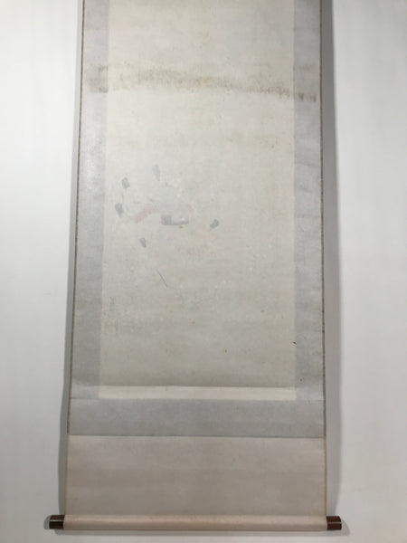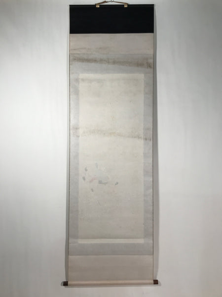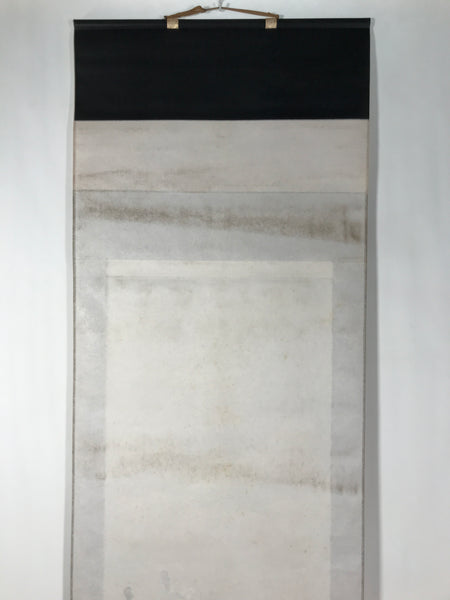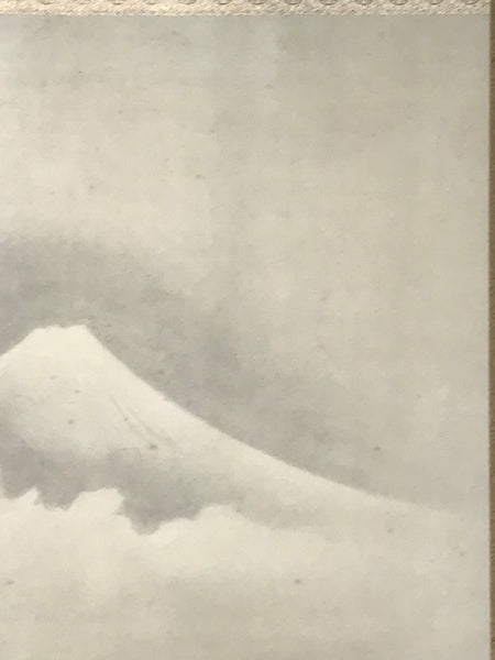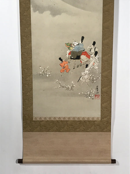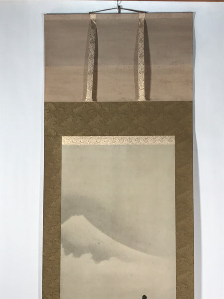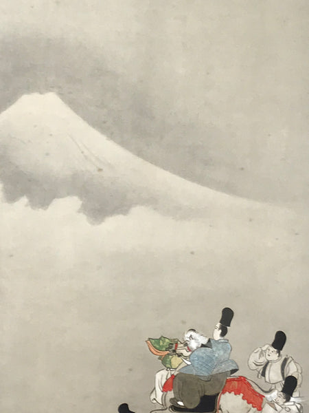 This vintage Japanese hanging scroll (kakejiku or makimono in Japanese) features a group of men dressed in kimonos and wearing black high hats staring at a high mountain, Mount Fuji, in the background. This scroll is a reproduction of an artwork by Ogata Korin called Azumakudari, an episode of The Tales of Ise (Ise Monogatari). This piece is signed and has a red seal.