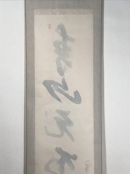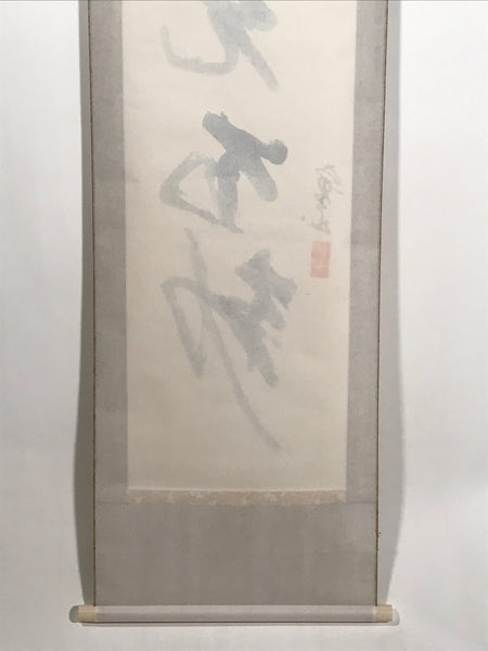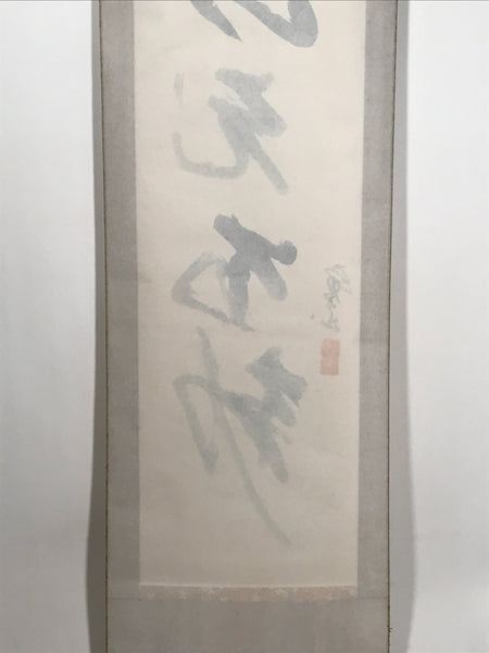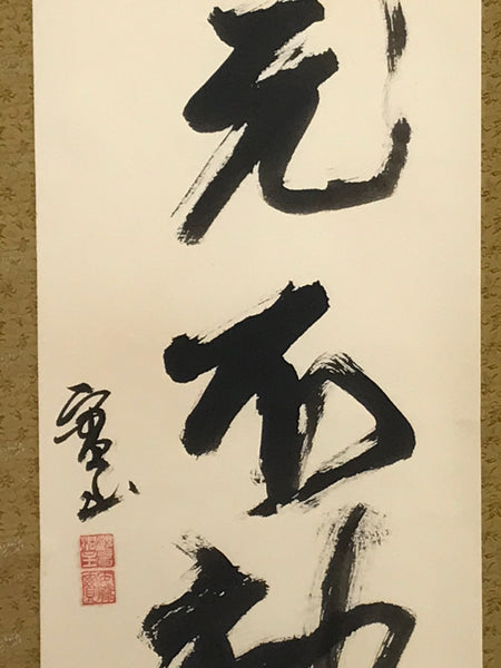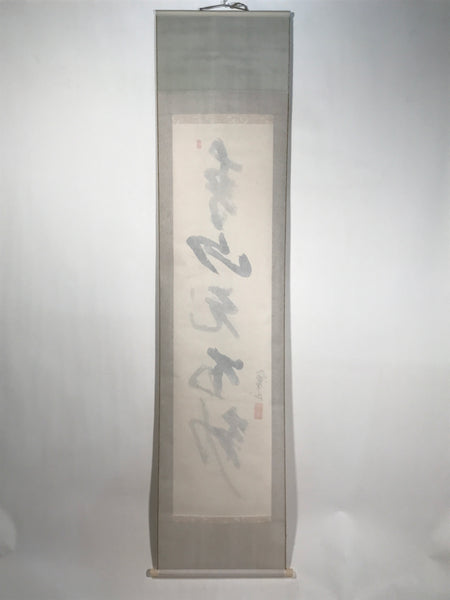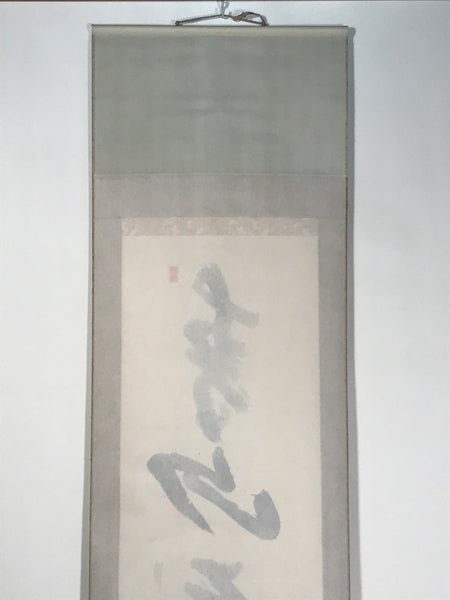 This vintage Japanese hanging scroll (kakejiku or makimono) features black-ink calligraphy with five big Japanese kanji characters: 青山元不動, translating to 'the mountains remain calm and serene'. This piece is titled and signed with a name and red seals.