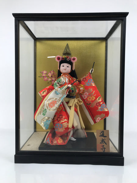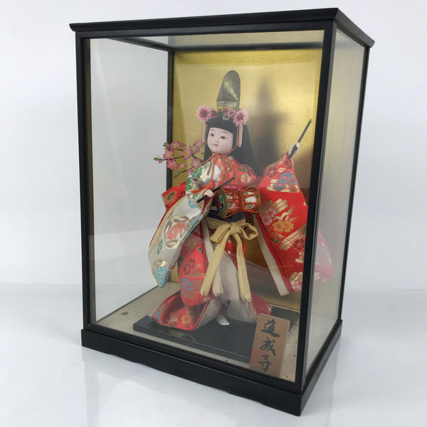 This gorgeous vintage princess ohinasama doll is dressed in a red-and-gold kimono with blue, yellow, and pink flowers. She is holding a small drum with two sticks; she is likely a musician. The doll's face is likely gofun and the hands are made of resin. She has a hat and a headpiece with flowers. This doll is placed in a glass case that opens from the front. The doll is wired into the bottom. It is a lovely display item of a generous size. The sign with inscriptions on it is detached from the bottom.