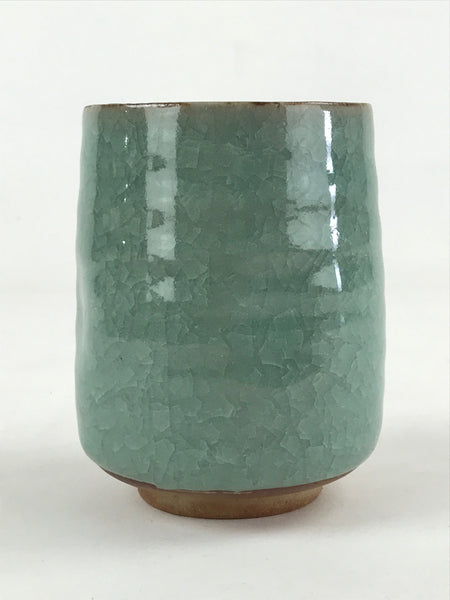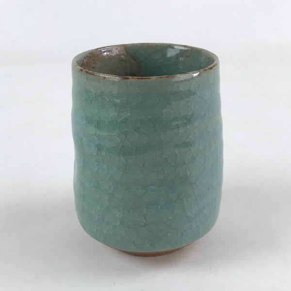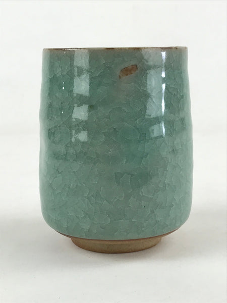 This vintage Japanese teacup has a crackled light green glaze with spots of brown and cream underlayer. It is tall and has some weight to it, so it rests nicely on one's hands.