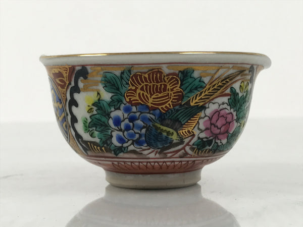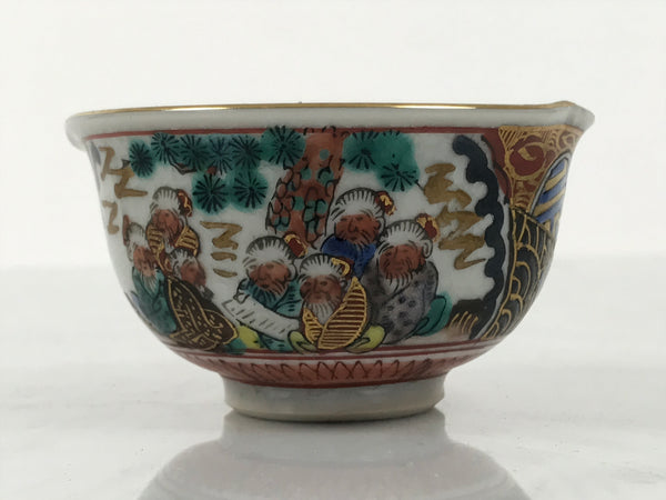This vintage Japanese Kutani porcelain tea cooling bowl. This piece is beautifully painted with images of flowers (peonies), a bird, and a group of old men with a paper document. The colors are rich, and you can feel the layers of paint. This type of cup/bowl is used in part of a traditional yunomi tea set. It is used to pour freshly brewed tea into to allow it to cool before pouring it into cups for guests. It has a subtle spout on one side of the rim and a small lifted edge to rest a thumb when pouring.