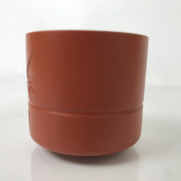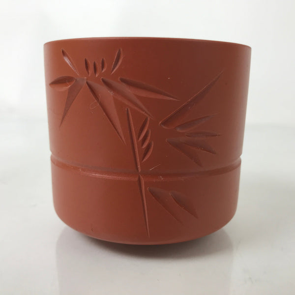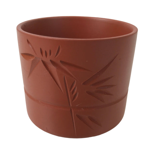 This is a vintage Japanese ceramic Tokoname ware teacup. Made of simple red clay, this pottery features a carved design of a bamboo stalk with leaves and a band around the middle. It is used for drinking sencha loose-leaf tea.