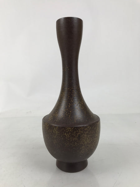 This is a vintage Japanese ceramic flower vase, or kabin. This vase is brown with speckled beige ash glaze, which is created naturally during the firing process. It has a bowl-like body and a long neck known as Tsurukubi. There is a very slight inscription on the body. It is an excellent choice for a simple single flower or floral branch. It can be used for all types of flower arrangements both ikebana and casual.