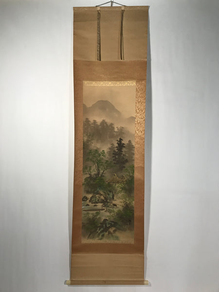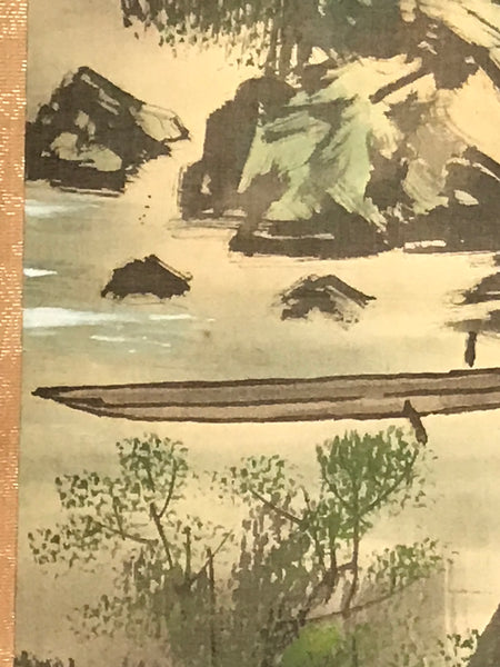 Japanese Boxed Hanging Scroll Kakejiku Vtg River Boat House Mountain Color KJ156