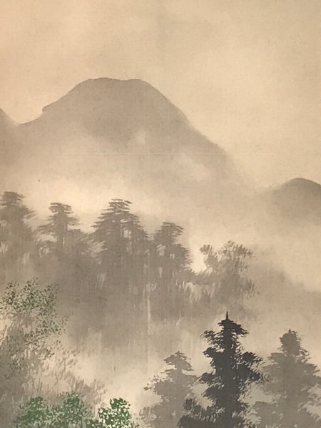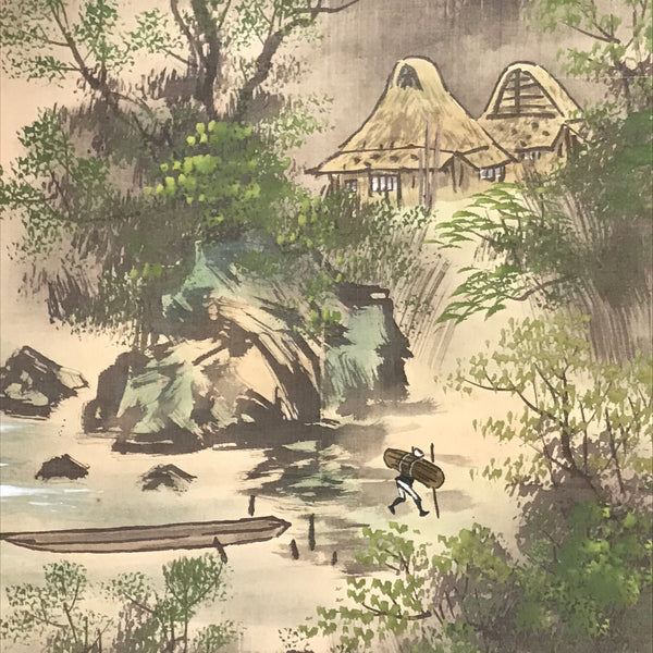 This vintage Japanese boxed hanging scroll (called kakejiku or makimono) features a man carrying rice straw on his back. There is a boat on a river and houses in the foreground. In the background, there are mountains and trees. This type of kakejiku is called sansui, literally mountains and water. It is painted in color, mostly green, brown, and black. This piece is signed with a name and a red seal. The box has inscriptions on the outside and the inside of the lid.