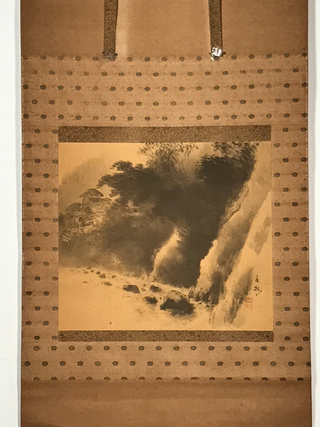 This vintage Japanese hanging scroll (kakejiku or makimono) features a landscape with houses in the background and a river and trees in the foreground. This piece is signed with a name and a red seal. It is stored in a wooden box.