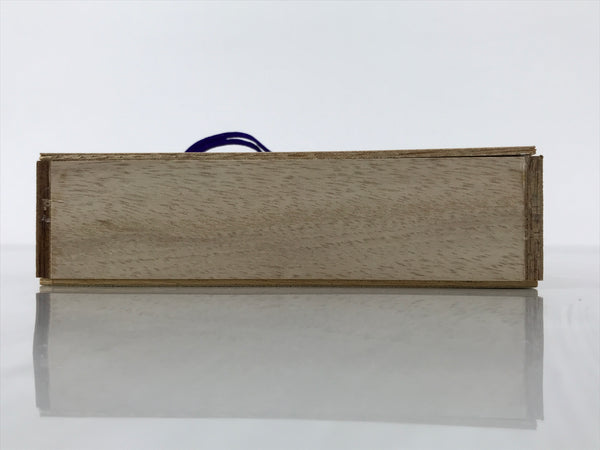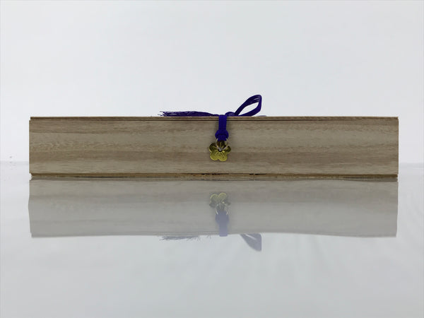 These are vintage Japanese Buddhist o-senko, incense sticks cased in a wooden box. It contains about four hundred and fifty-five sticks; seven bundles of incense sticks, and about sixty-five incense sticks in a bundle. Red paper bundling the sticks has a Japanese inscription. Purple string ties the wooden box and the lid, and the string is set with plum blossom-shaped metal parts on the box sides.