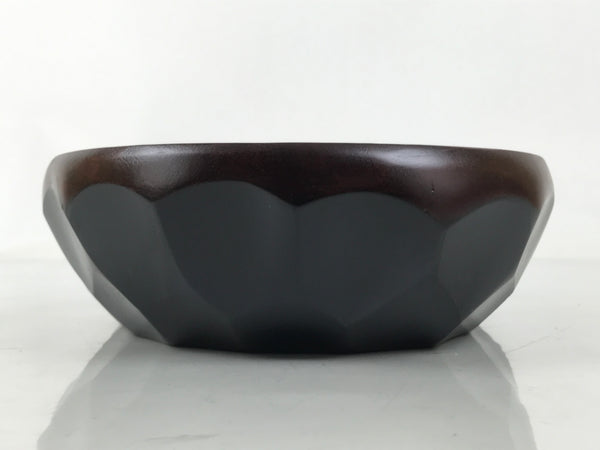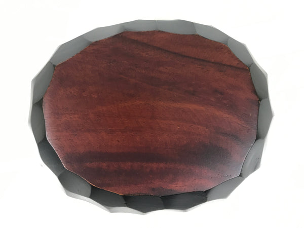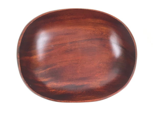 This is a Japanese vintage salad serving bowl. This oval dish is carved from wood and stained a deep brown with a clear brushed lacquer finish. The design features large chunks carved out from the sides (reminiscent of the kamakurabori style). It comes with matching hand-carved spoon and fork serving utensils.