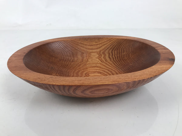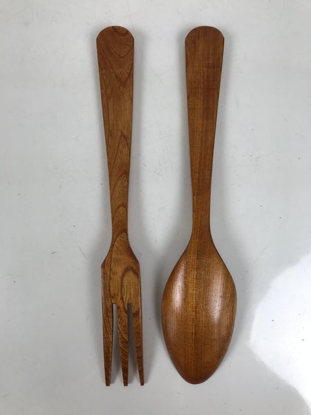 This is a Japanese vintage salad serving bowl. This simple oval dish is carved from wood and stained a golden brown (oak) color with a clear brushed lacquer finish. It comes with matching hand-carved spoon and fork serving utensils. It comes stored in a paper box.