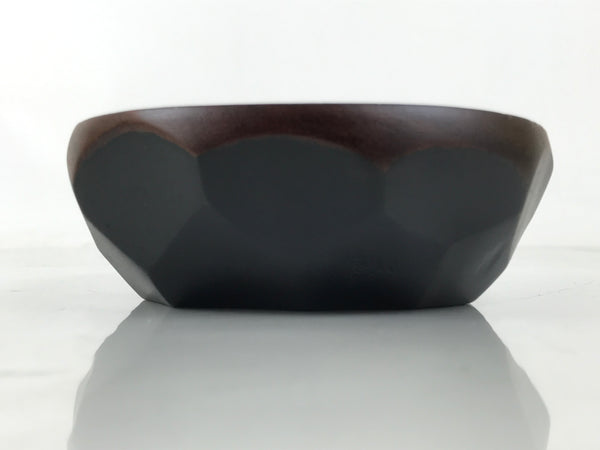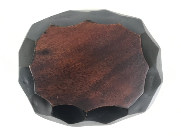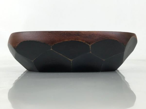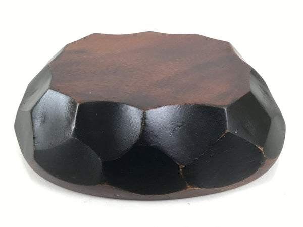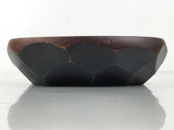This is a Japanese vintage small bowl, or kobachi, typically used for serving cold salad, fruit, and other dishes. This oval dish is carved from wood and stained a deep brown with a clear brushed lacquer finish. The design features large chunks carved out from the sides (reminiscent of the kamakurabori style). It can also be used for storing small trinkets, jewelry, keys, etc.