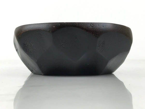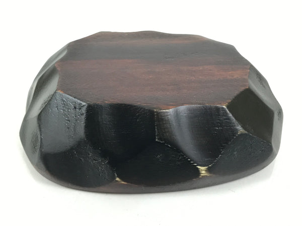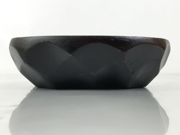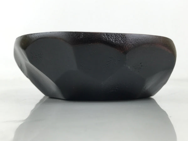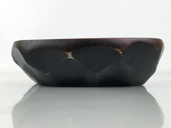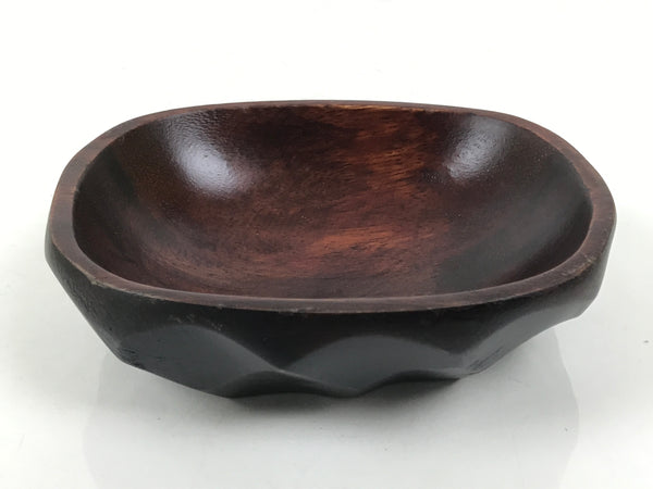 This is a Japanese vintage small bowl, or kobachi, typically used for serving cold salad, fruit, and other dishes. This oval dish is carved from wood and stained a deep brown with a clear brushed lacquer finish. The design features large chunks carved out from the sides (reminiscent of the kamakurabori style). It can also be used for storing small trinkets, jewelry, keys, etc.