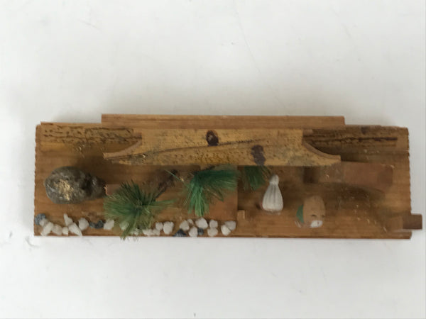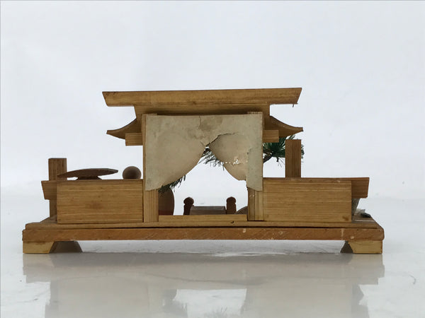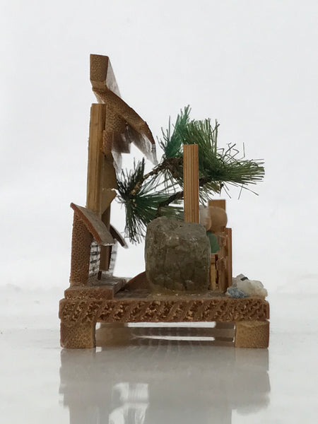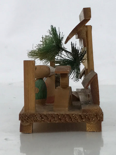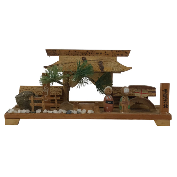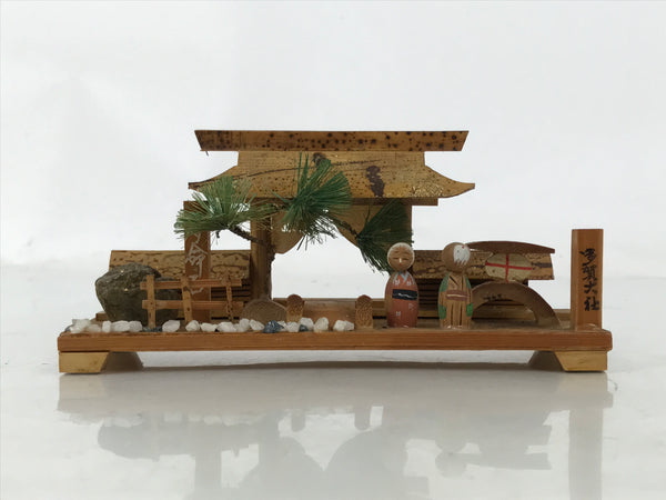 This vintage Japanese kokeshi figurine features a couple of elderly standing in front of a building representing the shrine Taga Taisha (Shiga prefecture). On the left, there is a stone with a panel writing 'stone of life'. The shrine elements are bamboo, and the couple is wood.