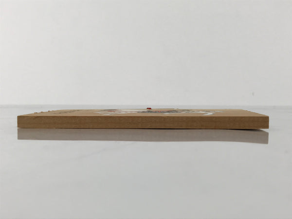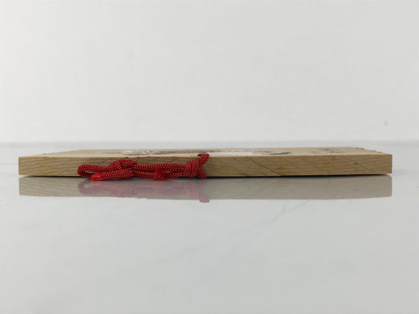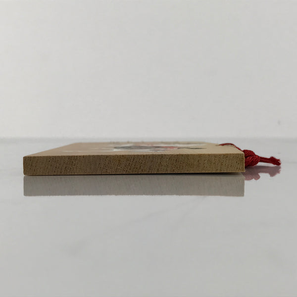 This vintage Japanese wooden decorative ema plaque features a picture of a decorative white horse. It has a red braided cord.