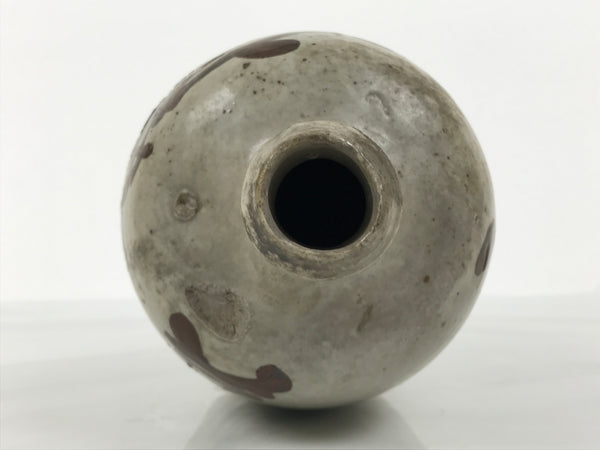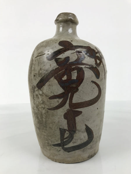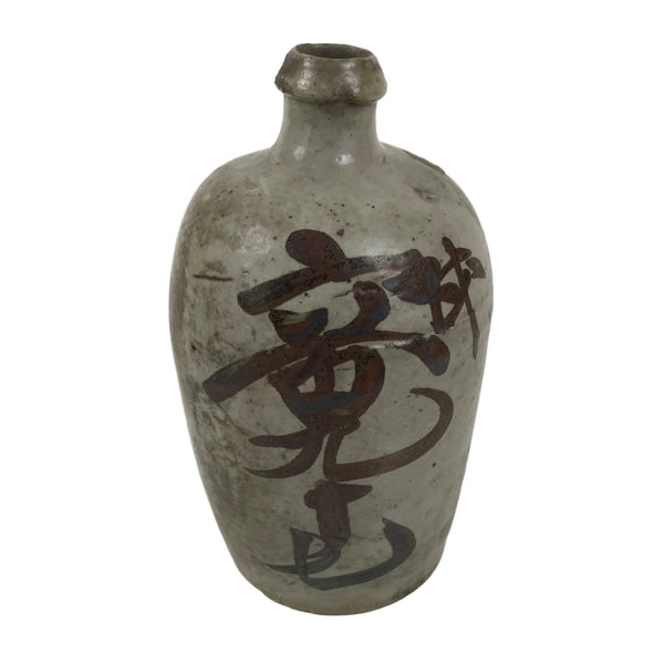 This is an antique Japanese ceramic sake bottle. It is called a Kayoi-Tokkuri and is used to pour sake. The commuting sake bottle became popular as a rental container for liquor stores in the Edo period when sake began to be consumed daily. This gray bottle has brown characters.