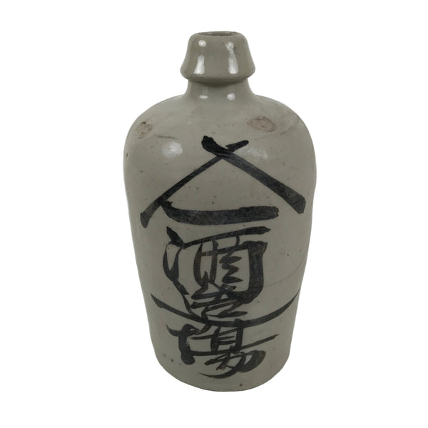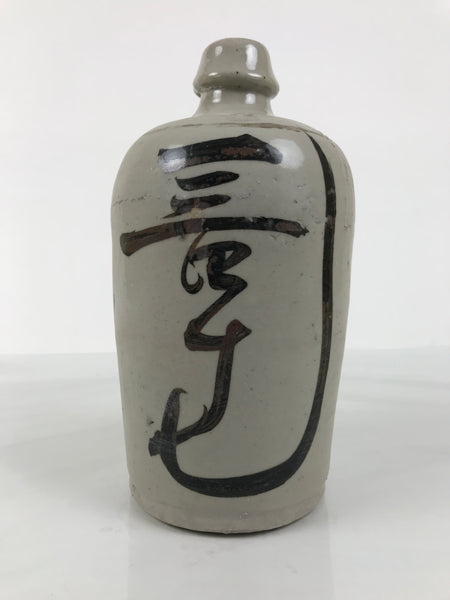 This is an antique Japanese ceramic sake bottle. It is called a Kayoi-Tokkuri and is used to pour sake. The commuting sake bottle became popular as a rental container for liquor stores in the Edo period when sake began to be consumed daily. This gray bottle has brown characters.