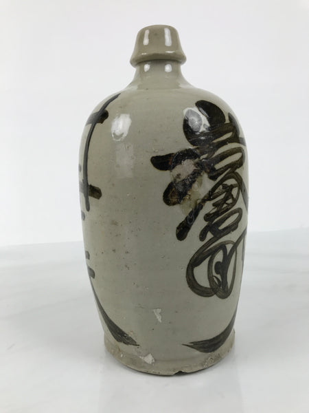 This is an antique Japanese ceramic sake bottle. It is called a Kayoi-Tokkuri and is used to pour sake. The commuting sake bottle became popular as a rental container for liquor stores in the Edo period when sake began to be consumed daily. This gray bottle has black characters.