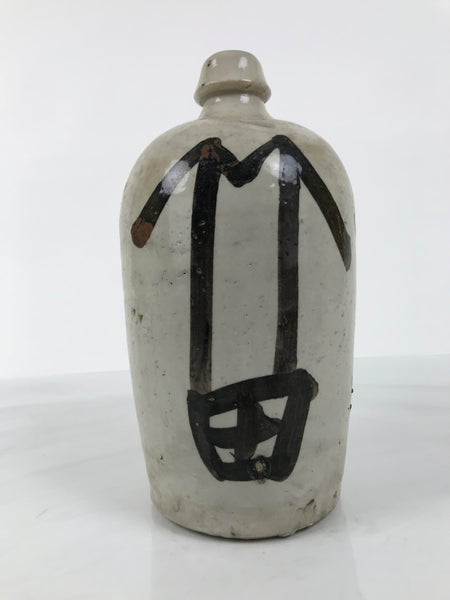 This is an antique Japanese ceramic sake bottle. It is called a Kayoi-Tokkuri and is used to pour sake. The commuting sake bottle became popular as a rental container for liquor stores in the Edo period when sake began to be consumed daily. This gray bottle has black characters.