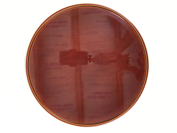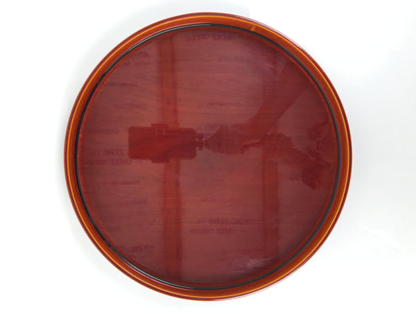 A vibrant, high-gloss reddish-brown color, this high-quality vintage Hida Shunkei lacquer Japanese serving tray is made of wood. It is a round with slightly raised sides so drinks cannot easily slide off.