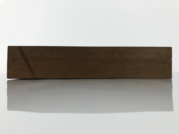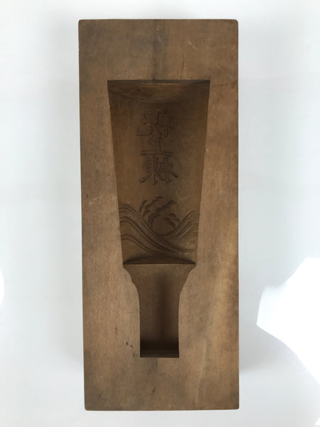 This two-panel carved wooden kashigata wagashi cake mold is in the shape of a hagoita, a popular traditional paddle. It has carved kanji (shukujoto 祝上棟) that congratulates someone for the completion of the building of the framework of a structure like a house or a business. At the bottom are rolling ocean waves for decoration. This mold can be used to make sweets or as an eye-catching decorative item.