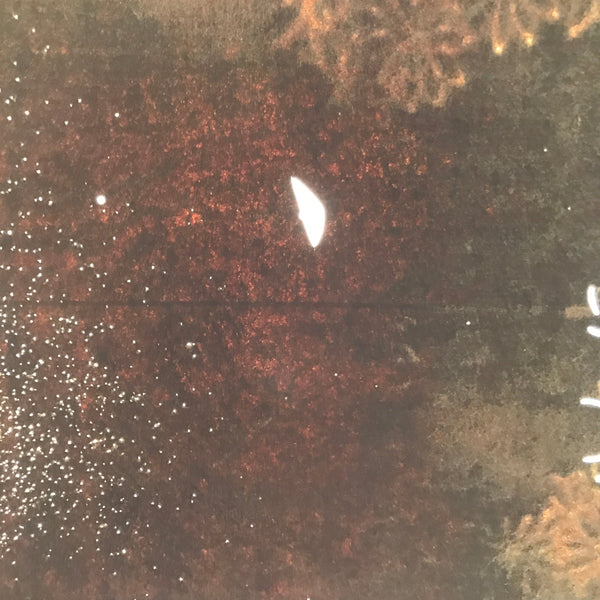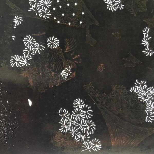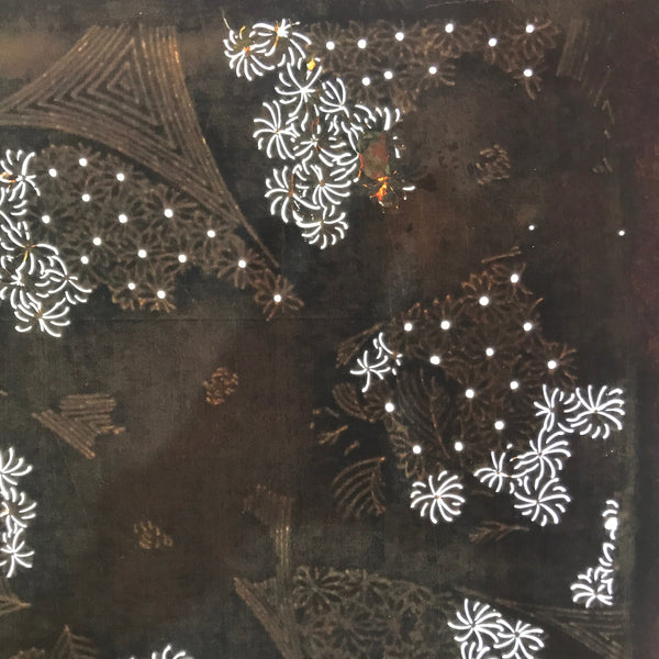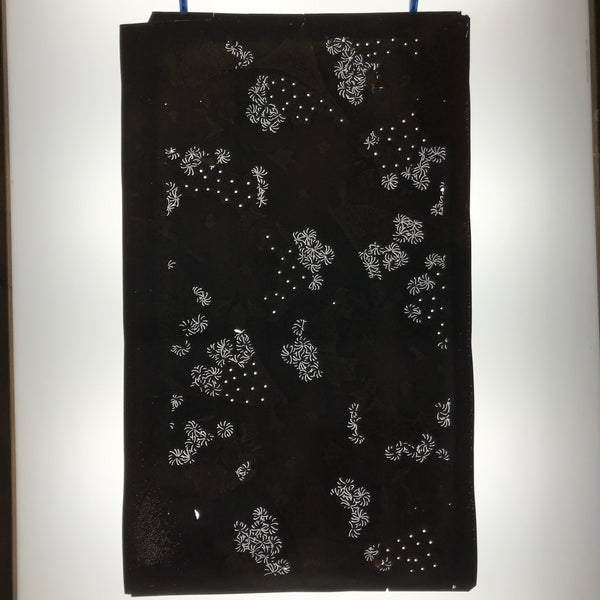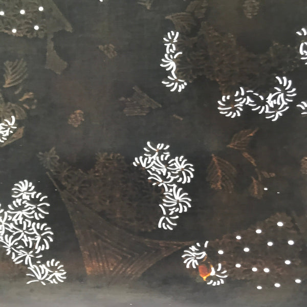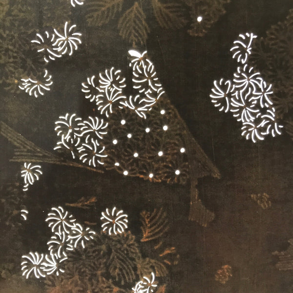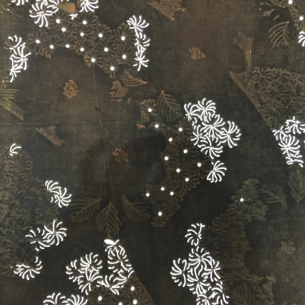 Using traditional mulberry paper, this katagami stencil with no silk mesh backing features clusters of small chrysanthemum flower (kiku). There is a shadow on one side that shows what the entire design may have looked like fully complete.