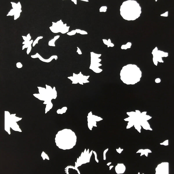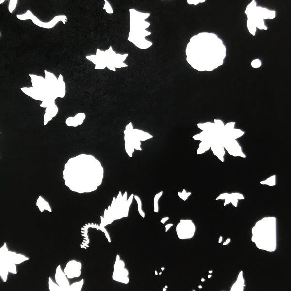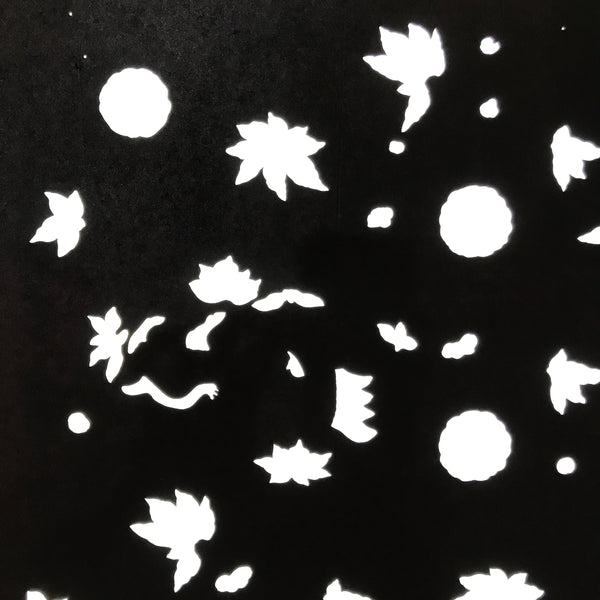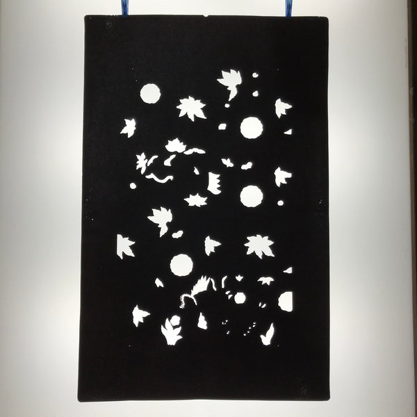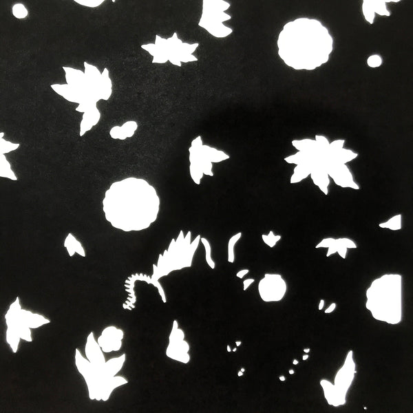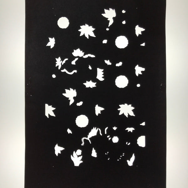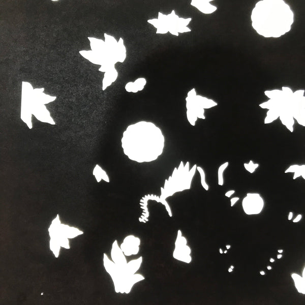 Using traditional mulberry paper, this katagami stencil with no silk mesh backing features  a simplistic and abstract floral and plant design. Much like most complex katagami, this is one piece of many that create one design, however it is very common for a set to be separated.