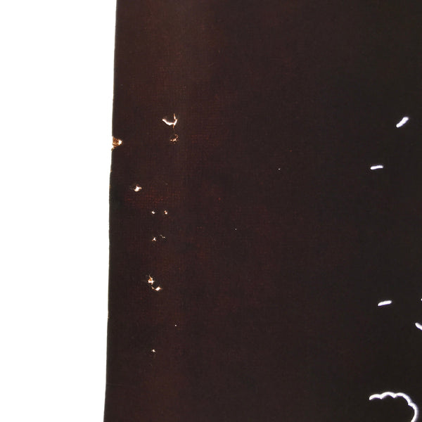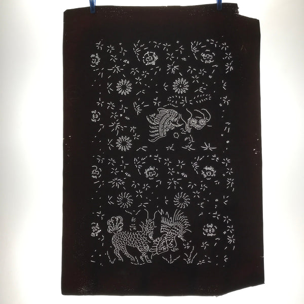 This antique Katagami was designed during the mid or late Edo period (1860) to early Meiji (1900) in Central Japan. It is made of two or more layers of handmade mulberry paper laminated together and waterproofed with persimmon tannin. Katagami printing uses a technique called resist dye where a paste is applied to the fabric with the katagami before dipping in ink. The open space on the katagami will be a negative space in the printed design.
