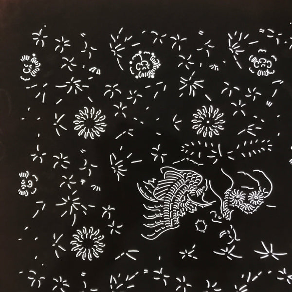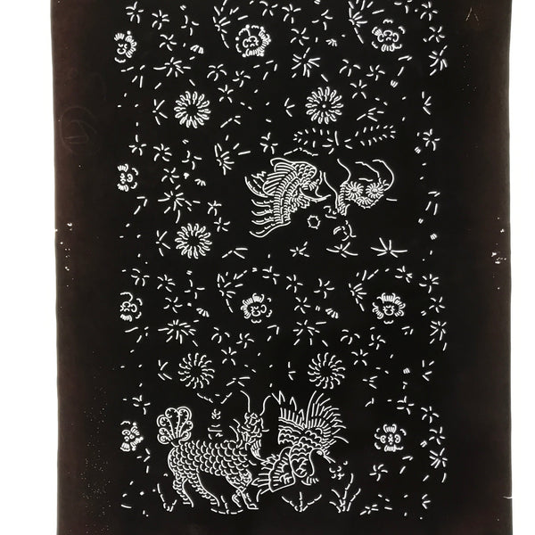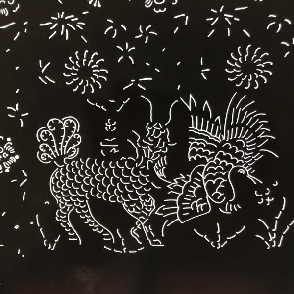 Using traditional mulberry paper, this katagami stencil with a silk mesh backing features  part of a depiction of kirin (mythical creature akin to a deer-shaped dragon) as well as that of a crane (tsuru). There are also various floral designs, some resembling chrysanthemums.
