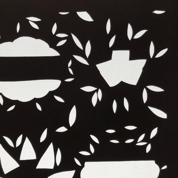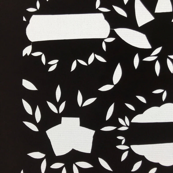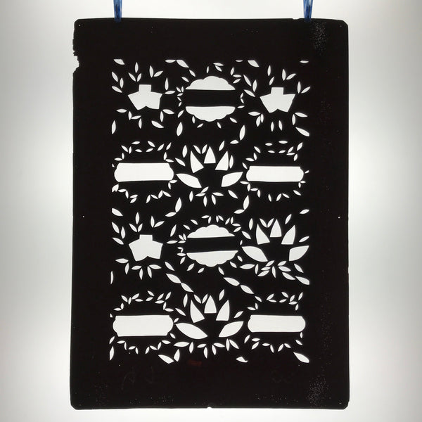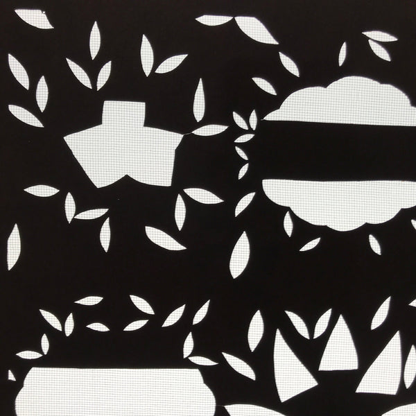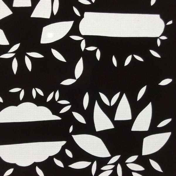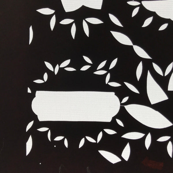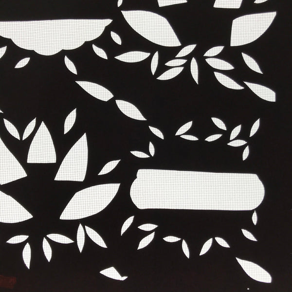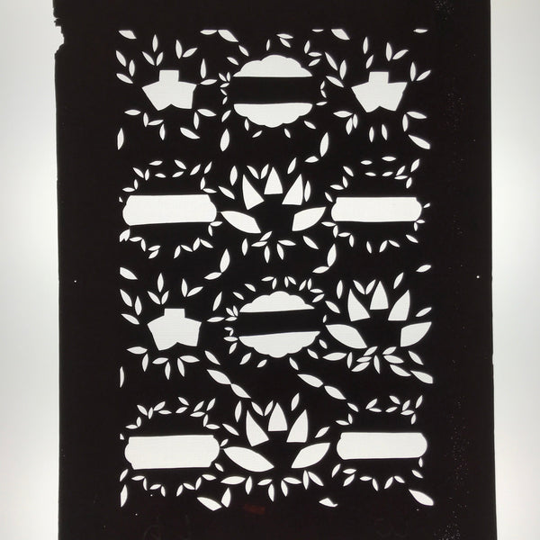 Using traditional mulberry paper, this katagami stencil with silk mesh backing features a silhouetted background with bordering leaves and is part of a much larger set of katagami. Unfortunately, these sets often get separated or lost over time.