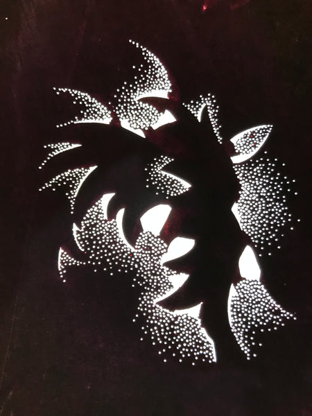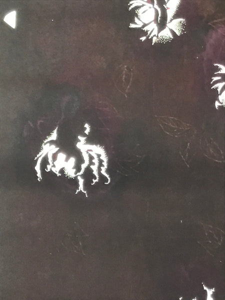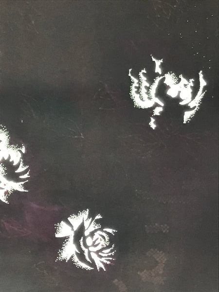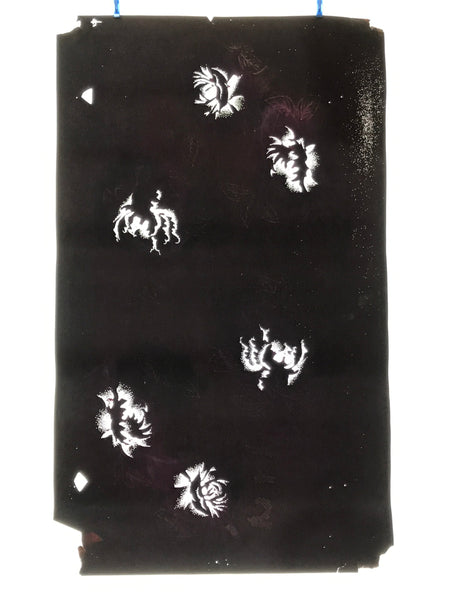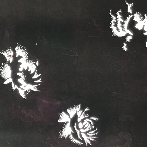 Using traditional mulberry paper, this katagami stencil with no silk mesh backing features parts of large peony flowers (botan). There is a shadow on one side that shows what the entire design may have looked like fully complete.
