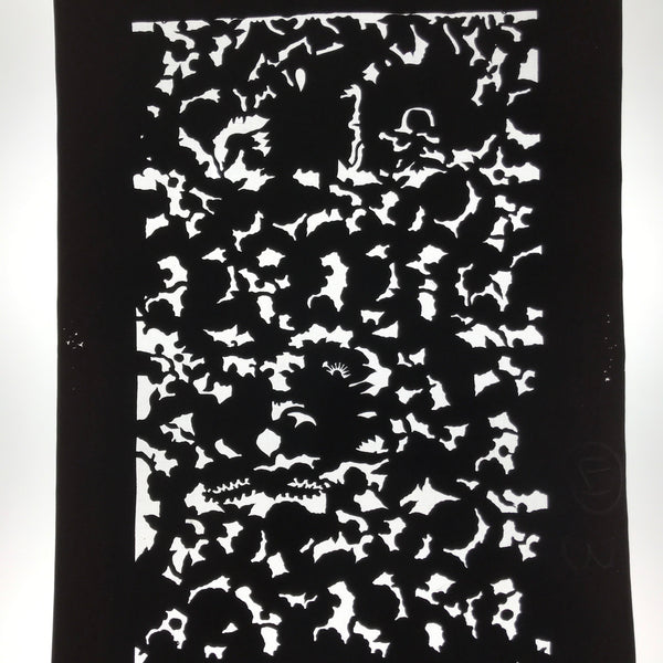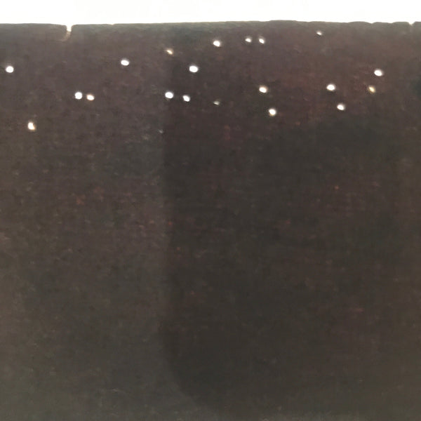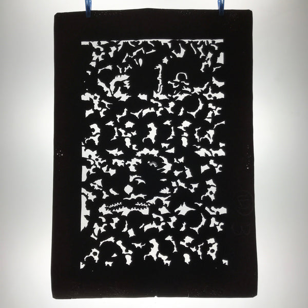 This antique Katagami was designed during the mid or late Edo period (1860) to early Meiji (1900) in Central Japan. It is made of two or more layers of handmade mulberry paper laminated together and waterproofed with persimmon tannin. Katagami printing uses a technique called resist dye where a paste is applied to the fabric with the katagami before dipping in ink. The open space on the katagami will be a negative space in the printed design.