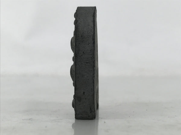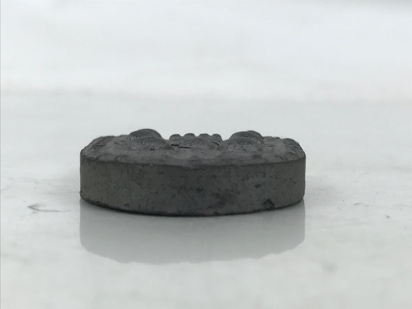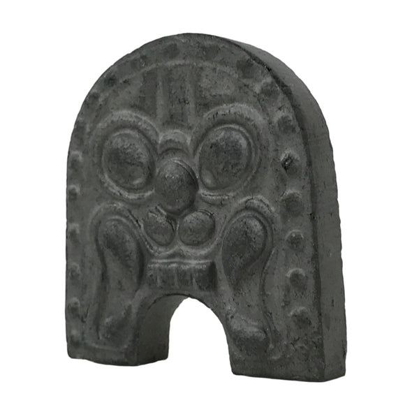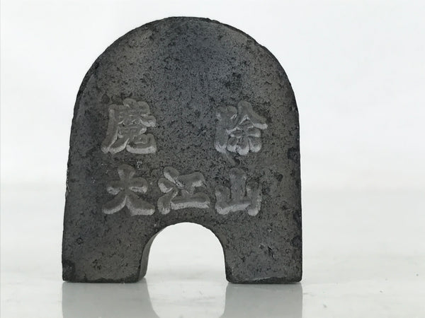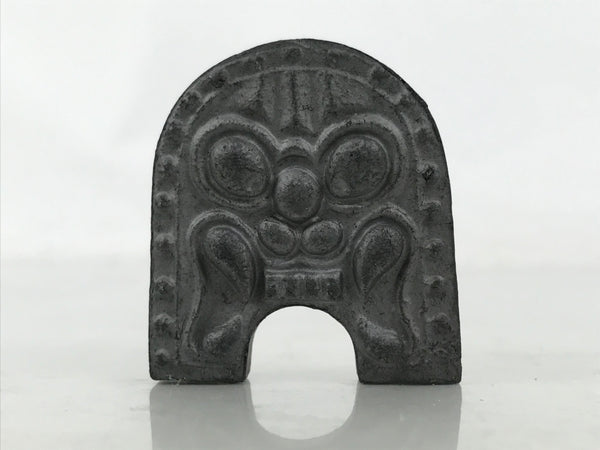 This is a miniature Japanese sculpted clay oni demon roof tile (kawara) decoration often found on temples and sometimes private residences. Also called onigawara, this ridge-end tile acts as an amulet to frighten off evil spirits and ward off misfortune and disaster. It appears to be a simple amulet/souvenir from Mt. Oe in Kyoto Prefecture.