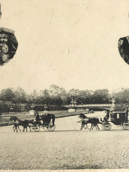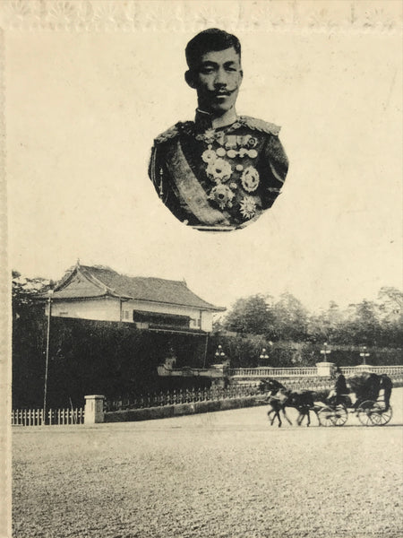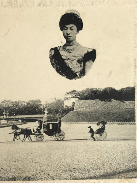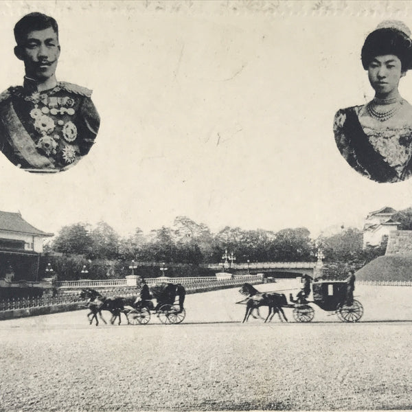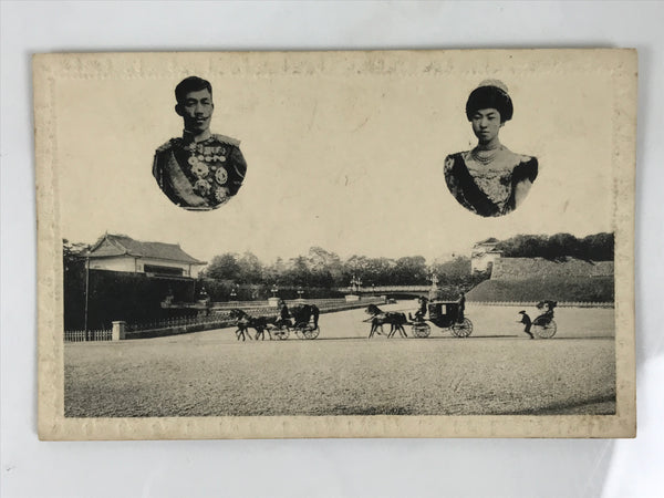 This is a black-and-white antique Japanese souvenir postcard featuring a photo of horse-drawn carriages with photos of Emperor Meiji and Empress Shoken. This postcard has a floral embossed border.
