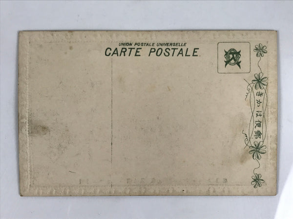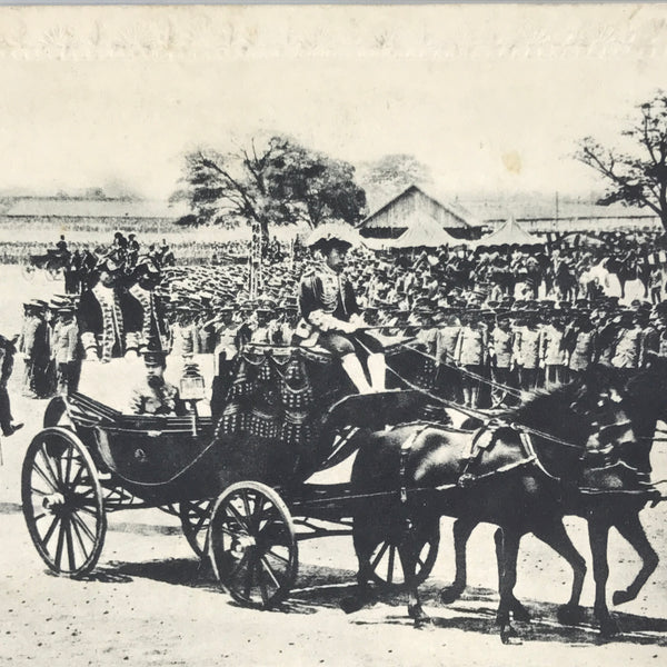 This is a black-and-white antique Japanese souvenir postcard featuring a photo of a Emperor Meiji reviewing the military at the Russo-Japanese War (1904-1905) Victory Parade held on April 30, 1906 in Tokyo. This postcard has a floral embossed border.