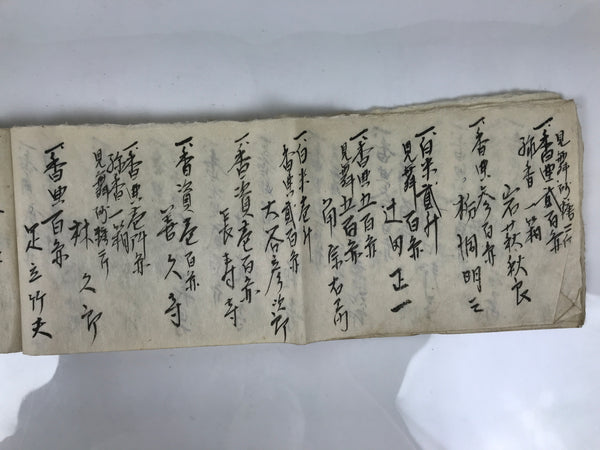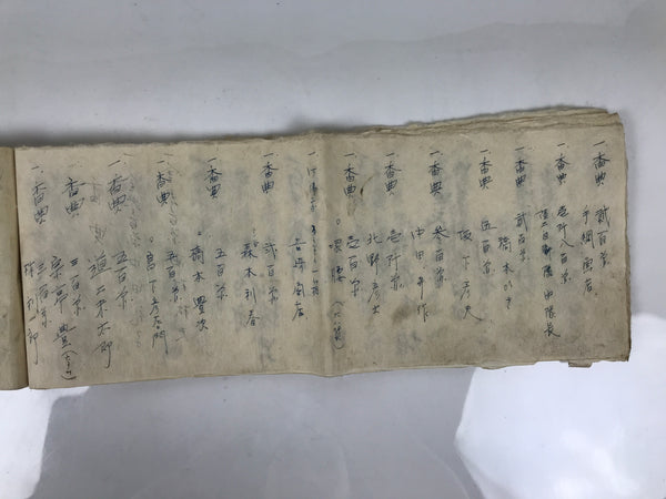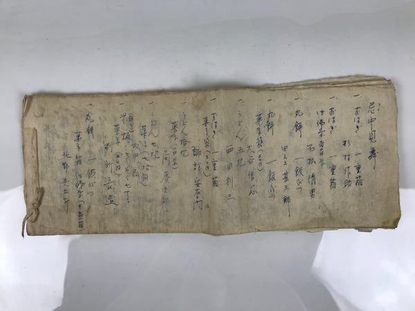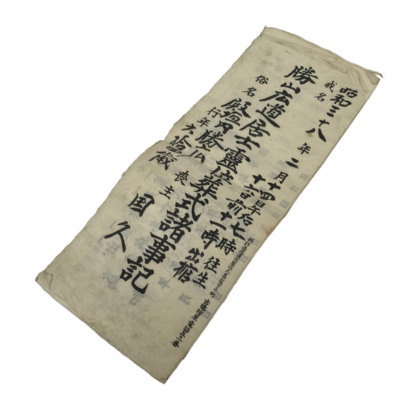 This is a vintage Japanese funeral record book called shoshiki shojiki in Japanese. It is made of washi paper and is handwritten. It contains private information about the deceased person and a record of money and food (mochi rice cakes, udon noodles) given by attendees at the funeral, with their names.