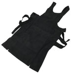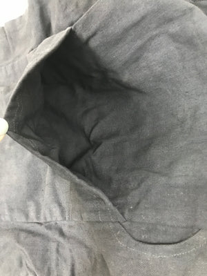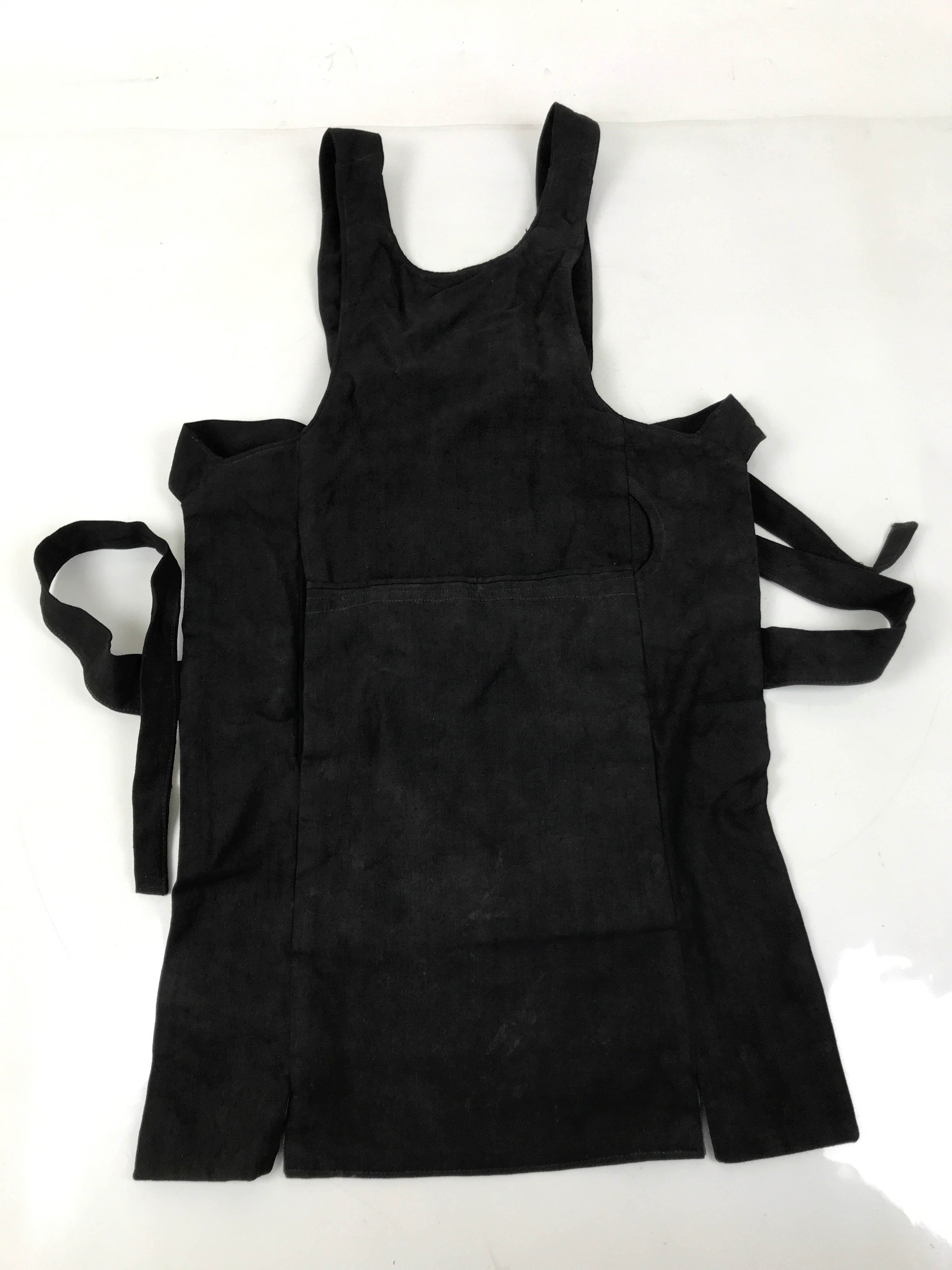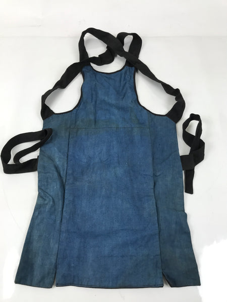 This is a vintage Japanese fireman's uniform apron, also called haragake. It is made of heavy black and blue cotton fabric with three pockets for tools. It fits small, close to the body, and over the head. Then it fastens with ties around the back of the waist. The top piece is narrower than standard aprons as to allow for better movement of the chest and arms.