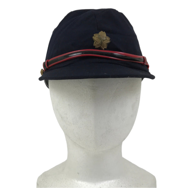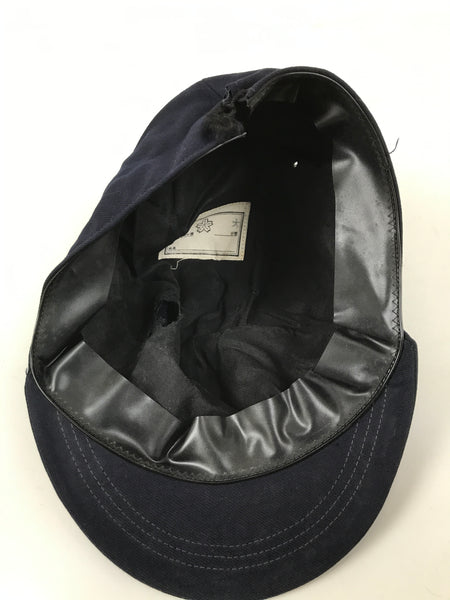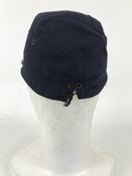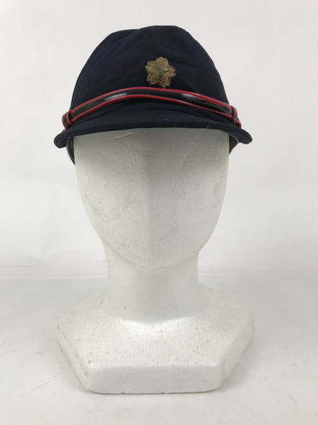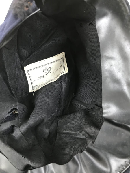 This is a vintage Japanese fireman's regular uniform hat. It is made of a navy blue fabric with metal rings at the top for ventilation. It is decorated with a red and black vinyl band across the front, indicating the hat's owner would have been a deputy division chief or division chief. There are two metal buttons on either side with a cherry blossom at the center as well as a large metal cherry blossom pin front and center.