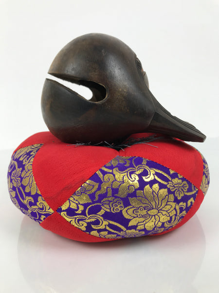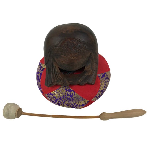 This is a vintage Japanese Buddhist altar fitting, Mokugyo (a fish-shaped wooden drum). Mokugyo is intended to keep the rhythm of sutra chanting by beating and sounding. It also helps to awaken people in sutra chanting. It is used in the Zen sect, Tendai sect, and Jodo sect. It can be used at home in front of a butsudan as well.