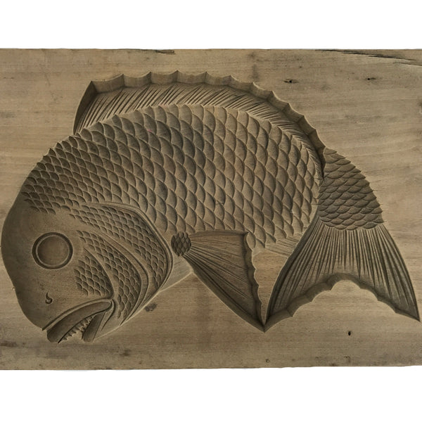 This two-panel kashigata mold is carved with the design of a sea bream fish (tai or madai). Served often in celebratory meals, this vibrant red fish symbolizes good luck. This mold can be used to make sweets or as an eye-catching decorative item.