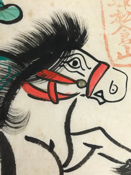 This vintage Japanese calligraphy painting features a white horse carrying on its back a big green and red bag with a big character on the front. There are several red seals to appeal good fortune placed around the horse.