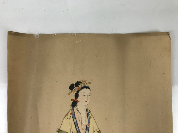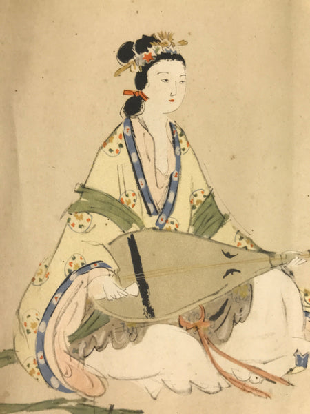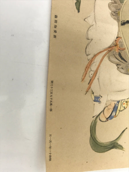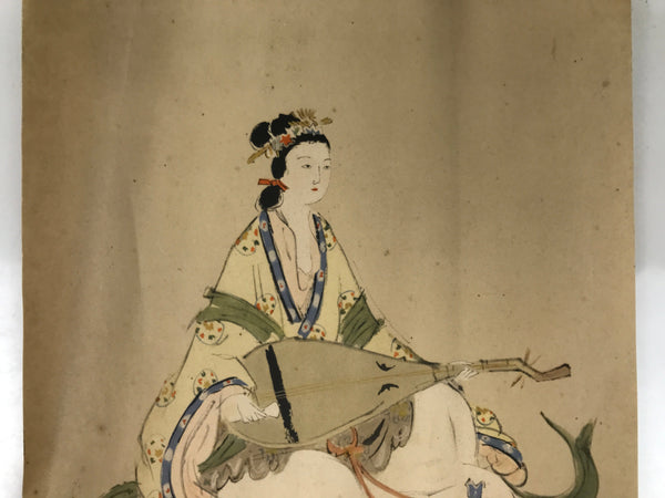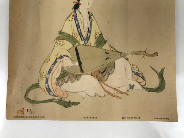 This vintage Japanese print reproduction features Benzaiten, also called Benten, one of the Seven Lucky Gods. Benzaiten is sitting and playing the biwa, a lute-like instrument. She wears a light-yellow kimono vest. This type of print is a gift that comes with magazines or newspapers.