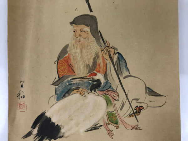 This vintage Japanese print reproduction features Fukurokujin, one of the Seven Lucky Gods. Fukurokujin, the god of wisdom, has the appearance of an old man with a stick and is petting a Japanese crane, or tsuru. This type of print is a gift that comes with magazines or newspapers.