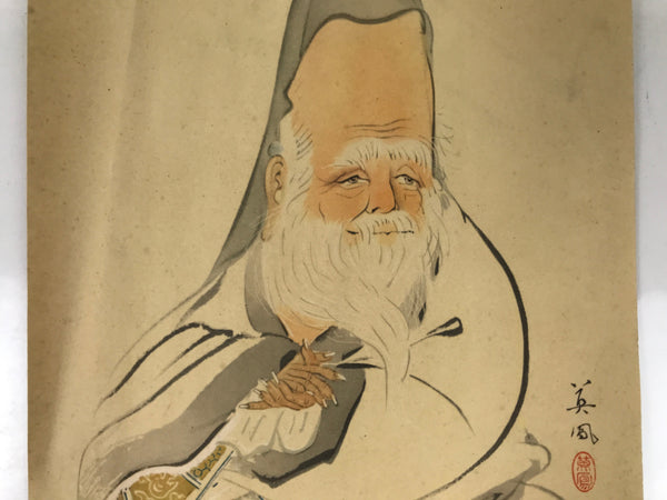 This vintage Japanese print reproduction features Jurojin, one of the Seven Lucky Gods. Jurojin, the god of the elderly, is depicted in his usual look: an old man with a tall forehead and a long white beard. This type of print is a gift that comes with magazines or newspapers.