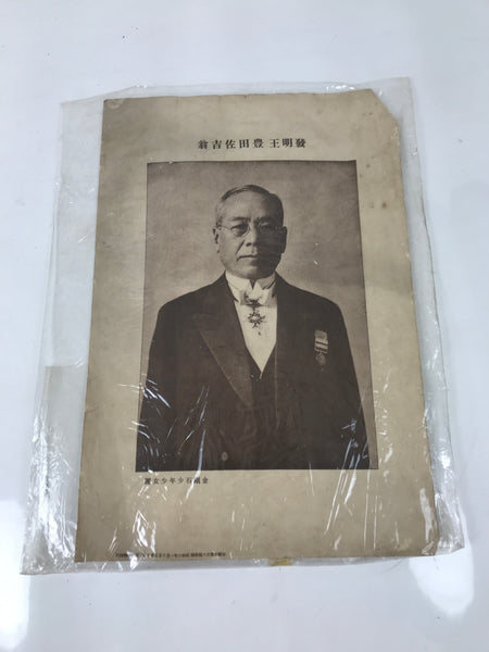 This is a vintage Japanese printed reproduction of a portrait of Sakichi Toyoda, the founder of Toyota Industries. It is a poster given as a gift in magazines or newspapers, called furoku. This sepia-colored poster is generous in size and features some inscriptions on top and below the portrait.