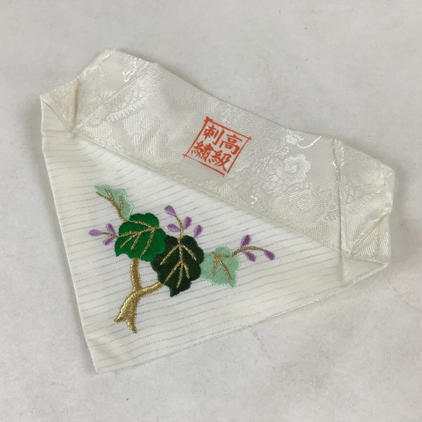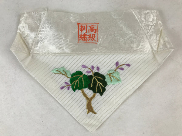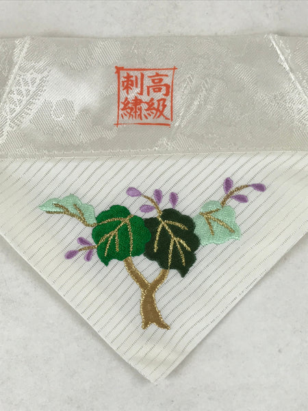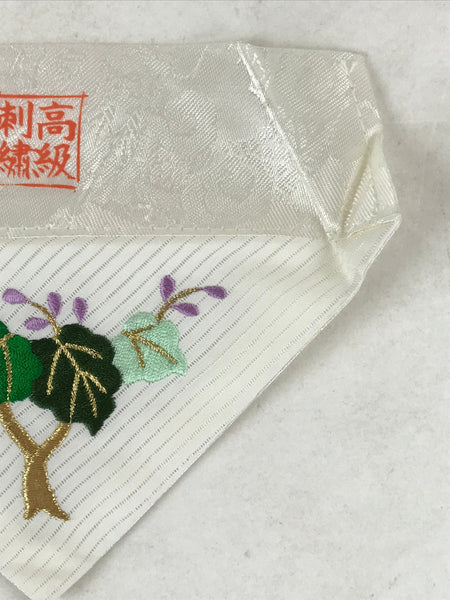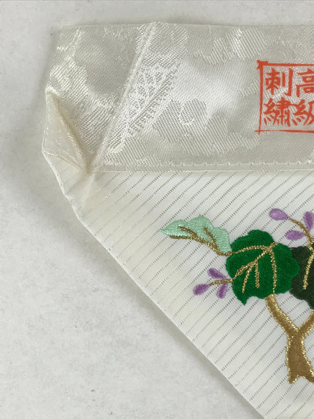 This is a vintage Japanese Buddhist altar tablecloth, or uchishiki. Made of silk and other woven fabric, the backside is white with a floral pattern while the front is also white with an embroidered tree with purple flowers.