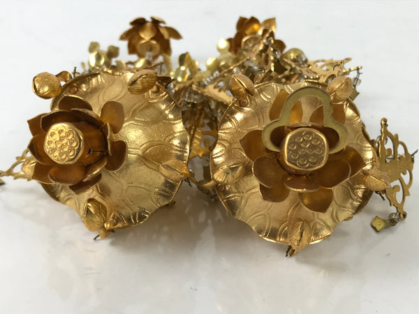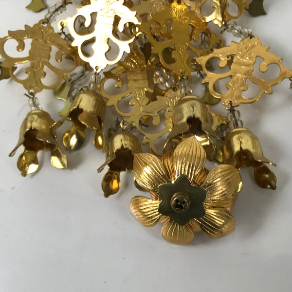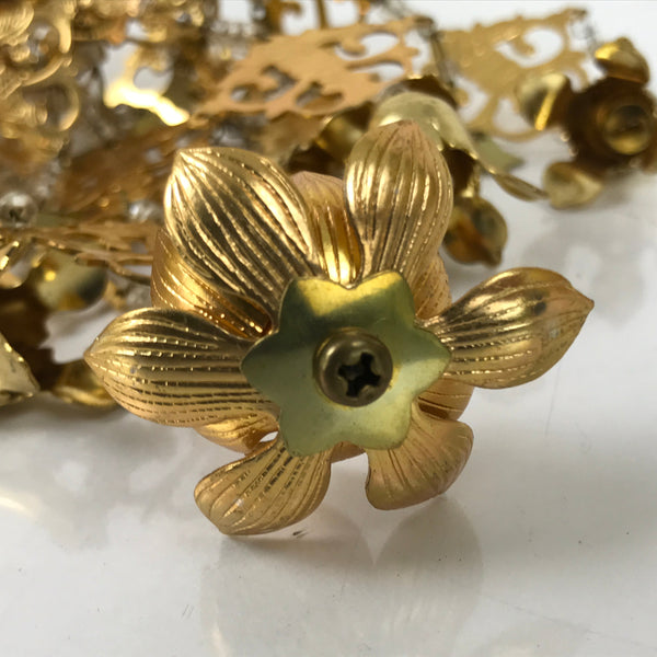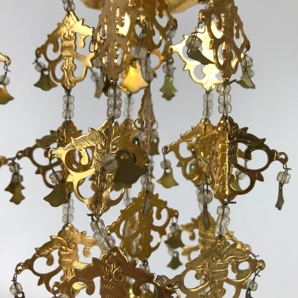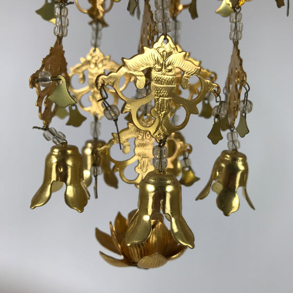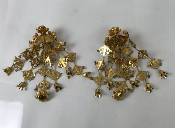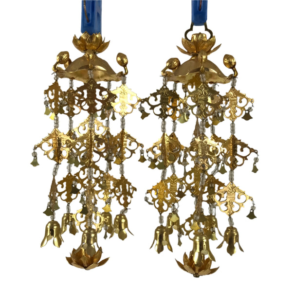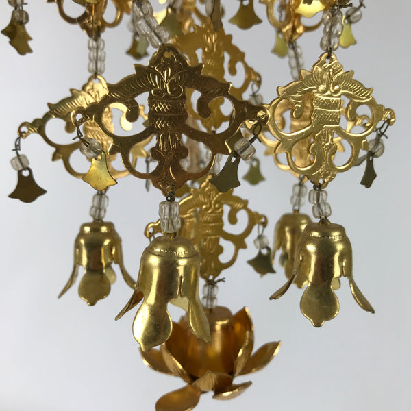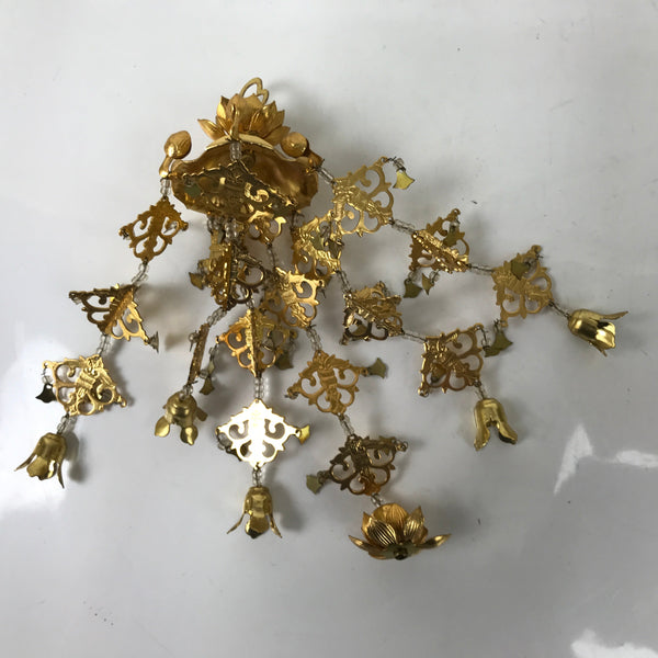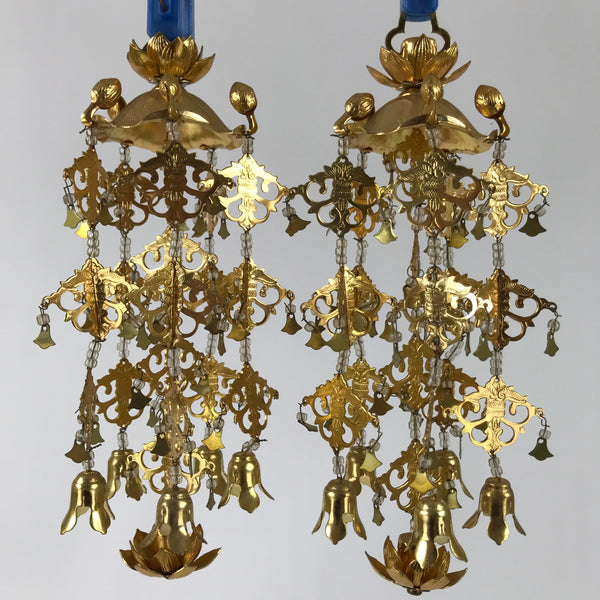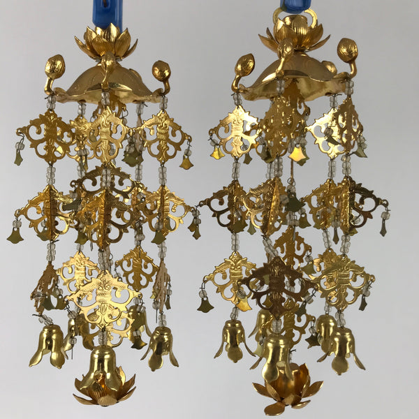 This is a vintage Japanese Buddhist altar-fitting pair of Yoraku. Yoraku is a hanging Buddhist item that is a beautiful decoration for any home altar and also serves as an amulet. This brass metal set features a lotus flower and leaf design. Each yoraku has six strands with metal pieces spaced out by clear beads. There are small metal lotus buds peeking up from the sides of the top piece which depicts a lotus flower leaf with a bloom at the very top.