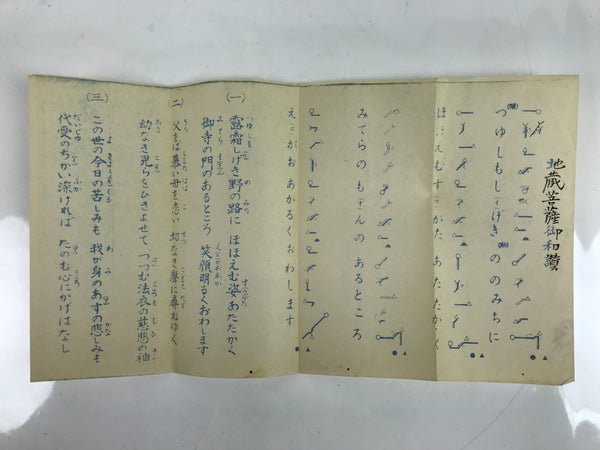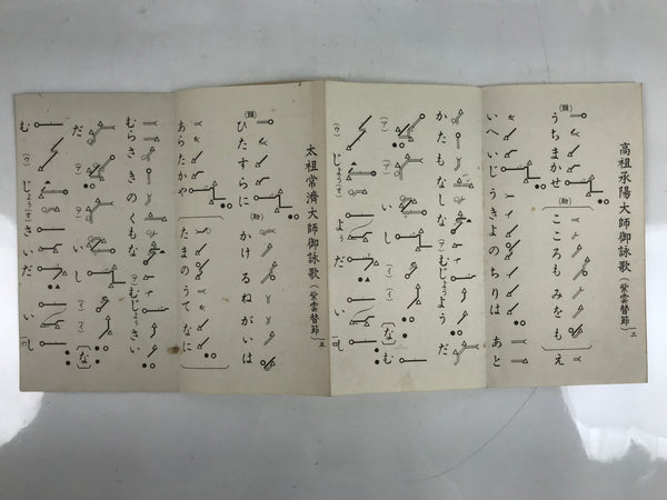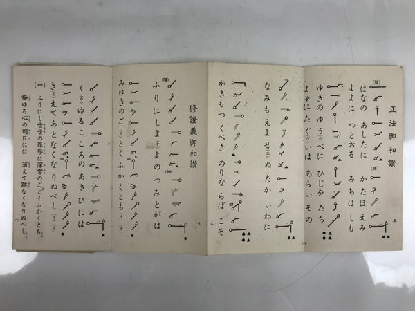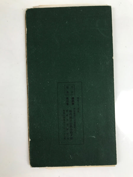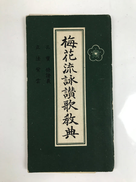 This is a vintage Japanese Buddhist prayer book. This book's title is Baikaryu Eisanka Kyoten, a sutra for Soto Zen. This sutra book features markings next to the lyrics, possibly the music score. It has an accordion-folded structure and dark green cover with a white ume plum flower design. It was published in 1957 (Showa 32).