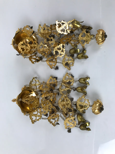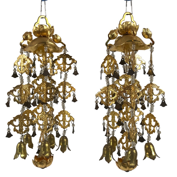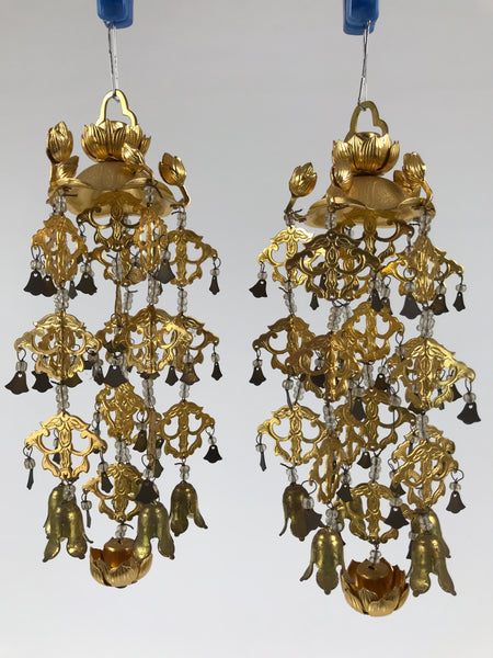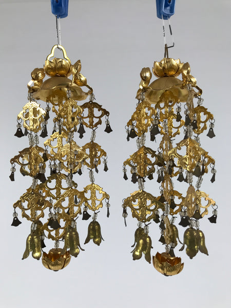 This is a vintage Japanese Buddhist altar-fitting pair of Yoraku. Yoraku is a hanging Buddhist item that is a beautiful decoration for any home altar and also serves as an amulet. This brass metal set features a lotus flower and leaf design. Each yoraku has six strands with metal pieces spaced out by clear beads. There are small metal lotus buds peeking up from the sides of the top piece which depicts a lotus flower leaf with a bloom at the very top.